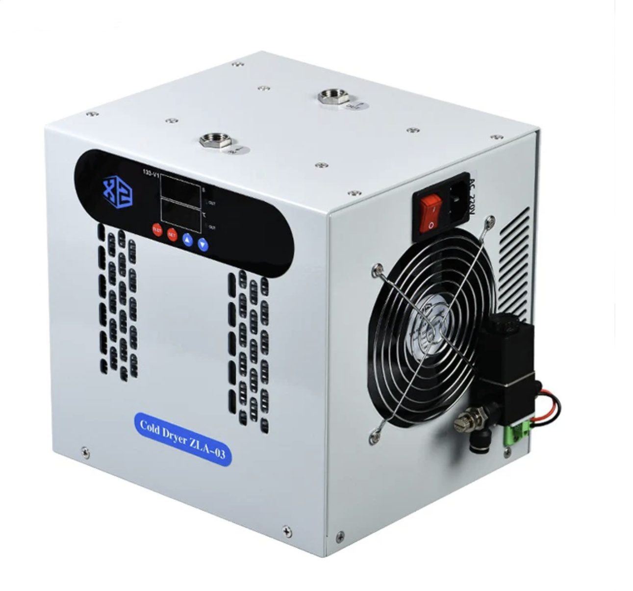 *This product is an electronic refrigeration air condenser. It is used to cool and dry hot and humid air and reduce the water content. It uses freeze drying and is mainly used to dry and purify the air source at the terminal to achieve the purpose of gas-liquid separation.  It can reduce the dew point and reduce humidity. This product adopts precise temperature control. The temperature is pre-set to keep the chamber temperature constant and comfortable, The cooler is custom fit for your Hyperbaric Chamber. Drainage device cycle timing work control time 0-9999 seconds.