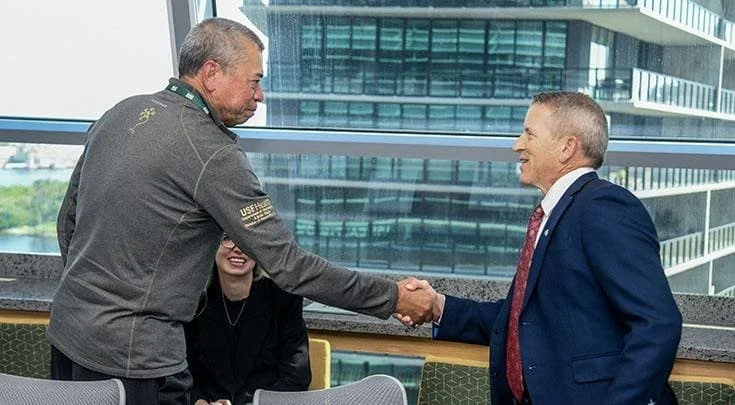 Harry van Loveren, MD, chair of the USF Health Department of Neurosurgery and Brain Repair, and interim chair of the Department of Internal Medicine, greets Paul Renner, speaker of the Florida House of Representatives, during Renner’s visit to the University of South Florida campuses. USF Health recently received $14 million grant from the Florida Legislature to study the effects of hyperbaric oxygen therapy for Florida veterans suffering from post-traumatic stress disorder with traumatic brain injury. Dr. van Loveren is the principal investigator of the study, which will begin recruiting participants in 2024.
