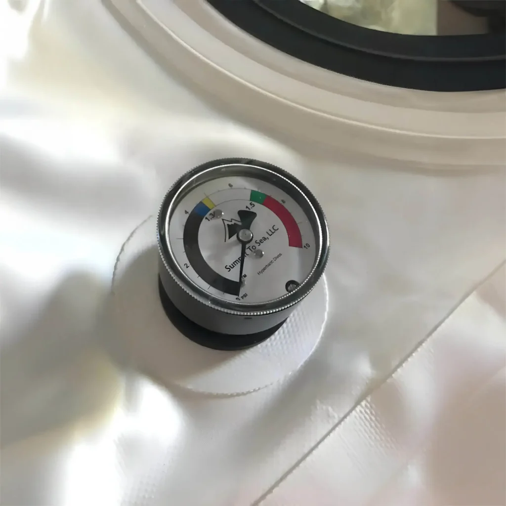 Easily monitor internal pressure during your HBOT session with this simple, chamber-mounted gauge—made exclusively for Summit to Sea hyperbaric chambers.